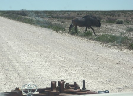 NAMIBIA ETOSHA, ÑU CRUZANDO LA PISTA TRANQUILO (STREIFEGNOU)