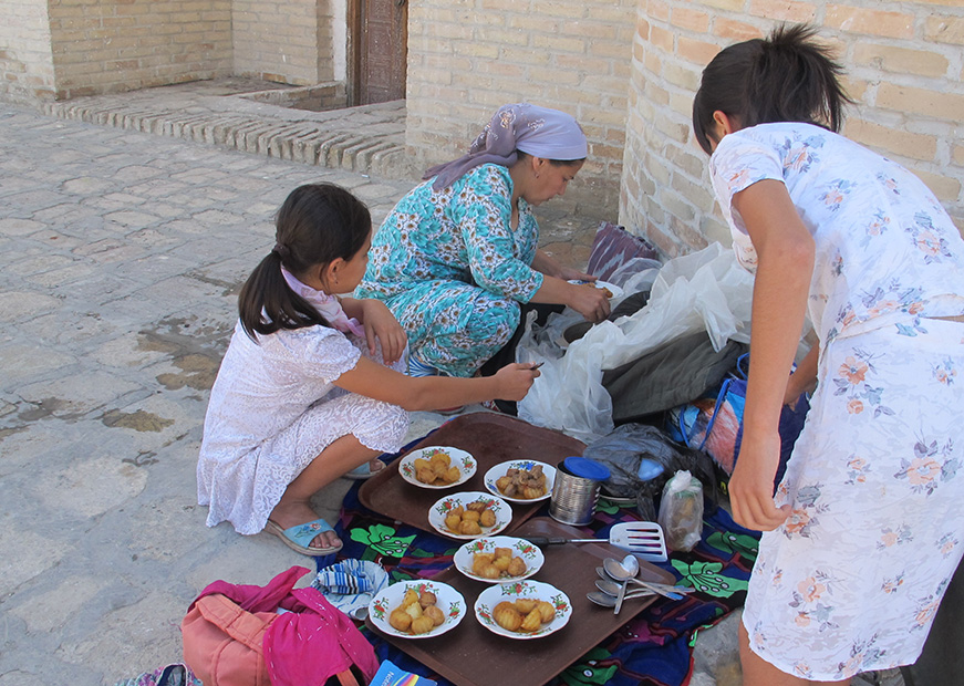 UZBEKISTAN 166 (LA VIDA EN BUJARA) VENDEDORAS DE COMIDAS , CUALQUIER SITIO ES BUENO PARA MONTAR UN RESTAURANTE