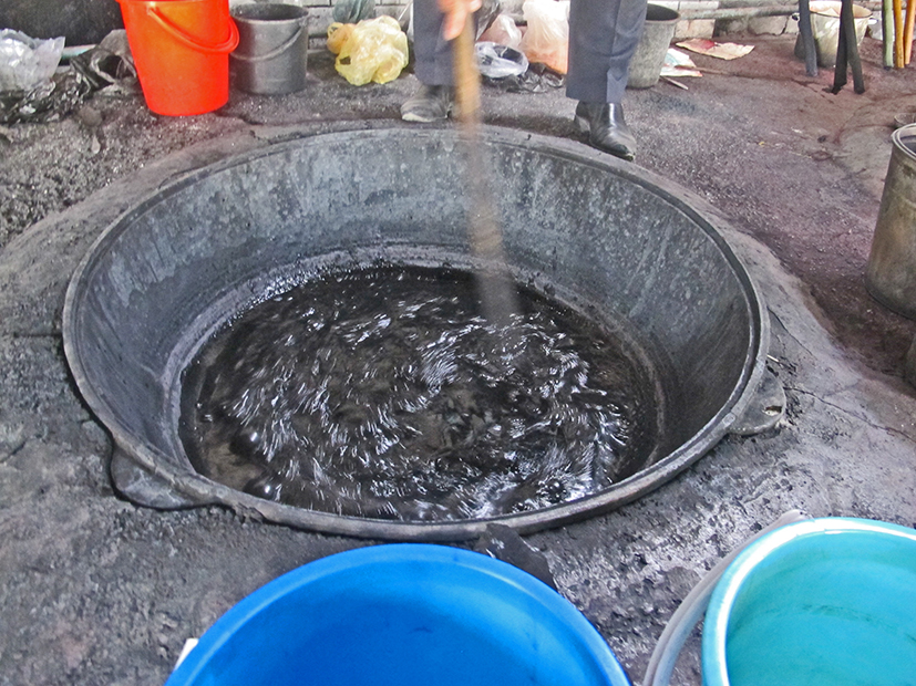 UZBEKISTAN 357 (MARGILON) FABRICA DE SEDA YODGORLIK, RECIPIENTE CON SULFATO DE HIERRO CALIENTE, TONALIZA LA SEDA A COLORES GRISES OSCUROS