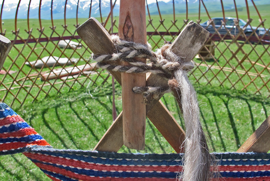 KIRGUISTAN 165 (DE ARSLANBOB A SUUSAMYR) MONTAJE DE UNA YURTA, NUDO HECHO CON CUERDA DE PELO DE CABALLO, PARA UNIR LA BASE CON LA CUPULA